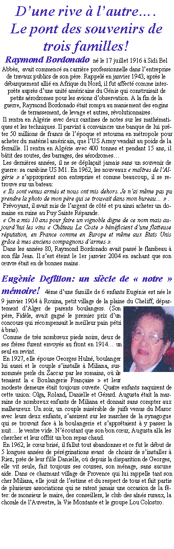 D’une rive à l’autre. Le pont des souvenirs de trois famillesd'Algérie : Raymond Bordonado , Eugènie Defillon, Arthème le Rouge...par Annie Robert.