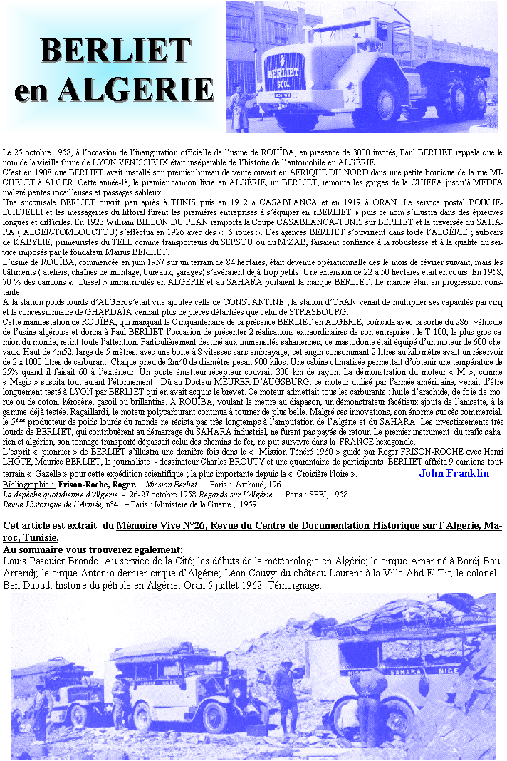 Berliet en Algérie, un article de John Franklin , mémoire vive , revue du CDHA