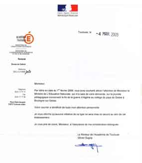 « Monsieur, par lettre du 1er février 2009, vous avez souhaité attirer l'attention de Monsieur le ministre de l'Education nationale, qui m a saisi de votre demande, sur la journée pédagogique (sic) concernant la fin de la guerre d'Algérie (resic) au collège du pays de Gesse à Boulogne-sur-Gesse. Votre courrier a bénéficié de toute mon attention personnelle. Je vous informe qu'aucune initiative de ce type ne sera mise en œuvre au sein de cet établissement [souligné par nous]. Je vous prie de croire. Monsieur, à l'assurance de ma considération distinguée. »