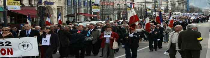 A quelques mètres à peine Michel Levy président du GNPI côtoyait Joseph Perez celui du CDHA ou Claude Rochette du Souvenir du 26 mars et de Notre Dame d Afrique, pendant qu’ au même moment Said Merabti d Ajir pour les harkis , Jean Paul Spina de la CNFA ou bien encore Ali Boualem , Andre Ordines président de la maison des rapatries de Marseille ou Gisele Ambrosino présidente des anciens de Fort de l’Eau , Beaudier de la CAPFA , De Torres du FNR marchaient d’ un même pas décidé