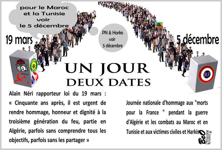 constitue la date la plus appropriée pour rassembler, autour d’un hommage aux morts pour la France et aux victimes des conflits de la décolonisation en Afrique du nord, les anciens combattants et les anciens supplétifs de l’armée française, les Français rapatriés, toutes leurs familles, et l’ensemble de la population française !