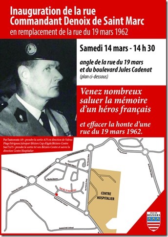 Le 14 mars prochain à 14h30, à l'initiative de Robert Ménard, maire de Béziers et algérianiste lui-même, sera inaugurée la rue Commandant Denoix de Saint-Marc en remplacement de la rue du 19 mars 1962.