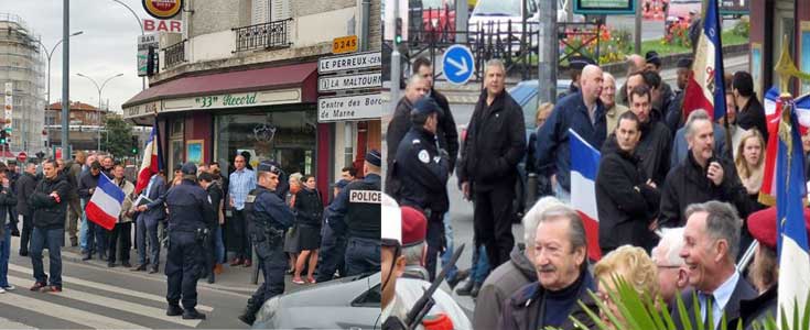 En présence d’associations d’anciens combattants comme la Fnaca (Fédération nationale des anciens combattants d’Algérie), des élus de la majorité UMP mais aussi du Front de Gauche, qui avaient félicité la ville pour cette initiative, une quarantaine de personnes s’étaient rassemblées sur le trottoir opposé pour manifester leur colère, à l’initiative du conseiller municipal FN Claude Lédion. « Le sang n’a pas cessé de couler le 19 mars 1962, il y a eu encore des soldats français de tués, des harkis massacrés, ce qui constitue un crime contre l’humanité, et des pieds-noirs qui ont eu le choix entre la valise et le cercueil », insiste Eric Fornal, ancien responsable départemental du FNJ, venu au nom du « Mémorial pour l’honneur français », une coordination regroupant notamment l’Association des combattants de l’union française, le Cercle national des combattants ou encore l’association Jeunes pieds noirs. « J’avais proposé que l’on nomme cette place en l’honneur de toutes les victimes de la guerre d’Algérie mais cela n’a pas été entendu », insiste de son côté le conseiller municipal FN.Manif FN Le Perreux sur Marne
