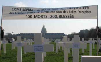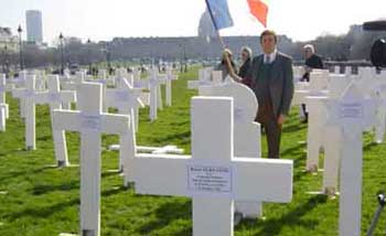 Le cortège s’ébranlait à nouveau, drapeaux et signes de sépulture en tête pour gagner l’esplanade des Invalides, où était prévu le deuxième temps fort de la cérémonie : la reconstitution d’un cimetière de guerre, troisième symbole, où allaient être implantées les croix, étoiles de David et stèles musulmanes, alignées et mêlées étroitement sans aucune distinction comme ont pu l’être les corps rassemblés à la morgue de l’hôpital Mustapha à Alger…