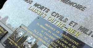 « Cette stèle a été érigée par l'Anfanoma. Elle est dédiée à tous nos morts. Le dépôt de gerbe était à la mémoire des victimes innocentes et sans armes du 26 mars 1962, qui se portaient au secours de Bab-El-Oued