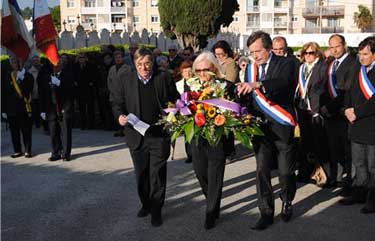 Christiane Giordano s’est exprimée avec beaucoup d’émotion rappelant le devoir de mémoire et de respect qu’il incombe à chacun de transmettre, puis elle donna la parole à Gérard Lopez qui fit lecture de la liste des victimes. Tous deux rejoints par le Maire Jean-Sébastien Vialatte, déposèrent au nom de l’Amicale une gerbe devant la stèle à la mémoire des morts restés en Afrique du Nord et Outre Mer puis, un bouquet au pied de celle du Souvenir français.