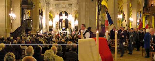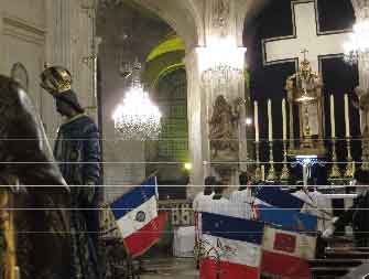 La statue de Notre-Dame d’Afrique, qui veille en permanence en cette Eglise sur la plaque dédiée à la mémoire de nos Victimes, occupe pour la circonstance la place d’honneur dans le chœur. A la fin de la messe, la foule sort en chantant « Chez nous, soyez Reine » et, sur le parvis, le fidèle Chœur Montjoie- Saint-Denis entonne avec une belle conviction « la cavalcade », suivie des « Africains » … Des voitures s’éloignent en klaxonnant les 5 coups « Algerie française »… Une bouffée d’air pur, vraiment !