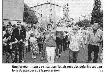 La procession mariale grand moment de ferveur de la journée était rehaussée par la présidence de Monseigneur Pierre-Marie Carré, Archevêque de Montpellier accompagné de monseigneur Robert Wattbled Évêque de Nîmes et suivi d'une multitude de prêtres.