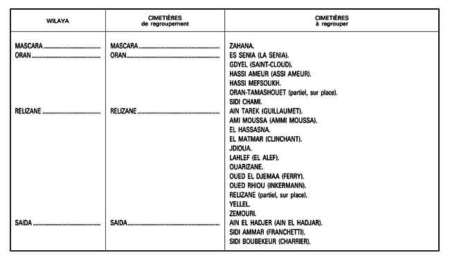Art. 1er.− Sur le fondement des propositions formulées par le consul général de France à Alger et de l’accord des autorités algériennes du 12 décembre 2005 susvisé, un regroupement, en tombes collectives ou ossuaires selon le cas, de sépultures civiles françaises dans l’ouest de l’Algérie est autorisé selon le tableau annexé au présent arrêté.