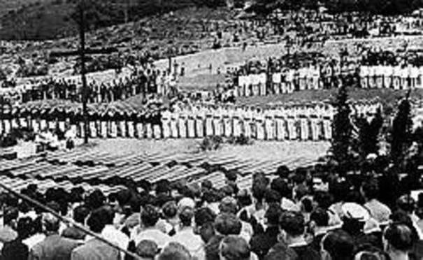 La cérémonie d'inhumation des victimes du 3 juillet 1940. Un document publié par Janvier Ferrara, dernier maire de Mers-El-Kébir, dans son livre « Mers-El-Kébir, le grand port »