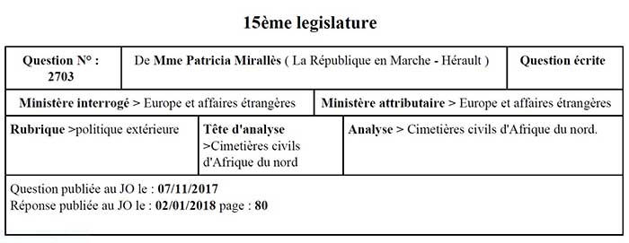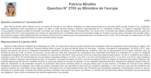 Le 7 novembre dernier, Patricia Mirallès membre de l’assemblée nationale française (la république en marche), avait destiné une question écrite au ministère de l’Europe et des affaires étrangères, dans laquelle il l’a interrogé sur l’état des cimetières civils français en Algérie, notamment l’avancement des opérations de regroupement. Hassen Bensaid