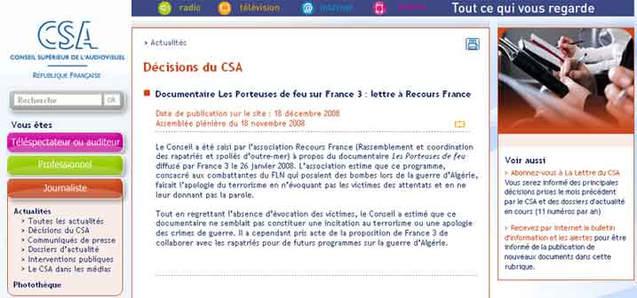 Je suis d’autant plus choqué que ma famille et moi-même avons été victimes du terrorisme, Monsieur Renauld BACHY, Président de la Mission Interministérielle aux rapatriés, pourra vous en informer. Je vous précise aussi que j’ai fait parti de la courte délégation reçue par Madame Geneviève GIARD, Directrice Générale de France 3 et ce, quatre mois après la diffusion du document en question. |