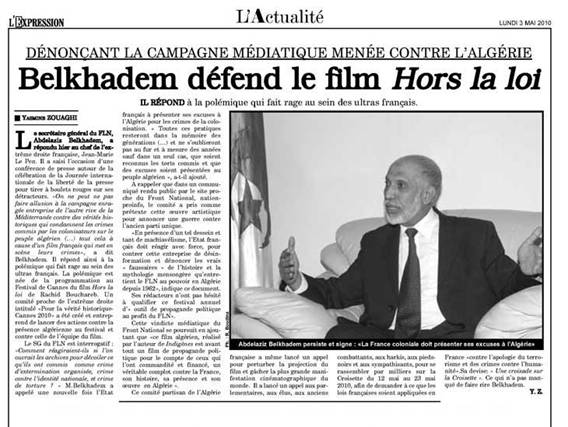 Abdelaziz Belkhadem Président du FLN apporte un soutien au film de Rachid Bouchareb, les Hors-la-loi, qui traite des méfaits de la colonisation. « Qui rappelle, leurs méfaits».Belkhadem aurait eu un long entretien avec le Président Bouteflika avant de téléphoner à Rachid Bouchareb, pour l’assurer de son « soutien » et de celui de « Bouteflika ». « Ce dernier se réjouirait de voir le massacre de Sétif qui avait coûté la vie à un milliers de personnes en 1945 occuper le devant de la scène et gêner les responsables français ».