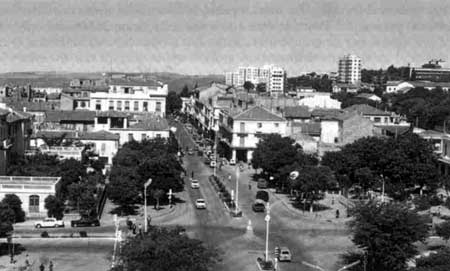 Perspective sur le début de l'avenue Georges Clémenceau. A droite le bâtiment blanc du mess des officiers et son parc. A gauche, le lycée Eugène Albertini. Au loin se dressent le nouveau quartier de la pinède. Au sommet de la colline, le moderne hôpital civil. Le regroupement des manifestants venant du sud et du nord s'est effectué sur le rond-point central pour s'engager dans l'avenue Georges Clémenceau.