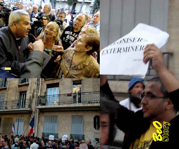 En face, quelques jeunes arborant des t-shirt du Parti des indigènes de la République brandissent des pancartes dénonçant : « colonisation = extermination » aux côtés d’élus comme Maurad Goual (adjoint UMP au maire du 5e secteur, mais démissionnaire) et Haouaria Hadj-Chick, conseillère d’arrondissement PC dans le 13eme arrondissement de Marseille, les esprits s’échauffent, on manque d’en venir aux mains. La police fait barrage. Des excités scandent « OAS assassins », une dame lance des « extrémistes », « pourris », de l'autre côté de la rue une dizaine de jeunes, majoritairement issus du nouveau "Parti des indigènes de la République" brandissent des affiches "8 Mai 45 : France Libérée, Algérie assassinée". Huées du côté des Pieds-Noirs. Dans son tee-shirt rose, un militant FN bien connu s'avance, menaçant, vers ses opposants. La police s'interpose en douceur.
