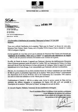 Il m'est agréable de vous faire savoir que la mémoire de Monsieur Paul Teuma sera honorée par l’attribution de la mention "Mort poour la France" en application des dispositions de l'article L. 488 du code des pensions militaires d'invalidité et des victimes de la guerre.