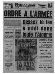 La une de France-Soir datée du 20 mars 1962, annonçant l'entrée en vigueur du cessez-le-feu.