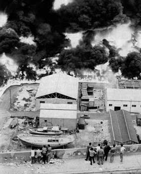 Incendie de réservoirs de pétrole dans le port d'Oran déclenché par l'OAS (Organisation armée secrète), le 25 juin 1962.