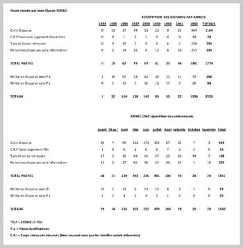 La récente polémique de Monsieur Pervillé relative à sa recension concernant le prochain livre de Jean Jacques JORDI sur les disparus, éclaboussant le Mur des disparus, m' a incité à sortir de l' ombre en vous soumettant le récapitulatif joint. Bien entendu, les chiffres mentionnés n' ont pas l' onction de légitimité absolue car j' ai pu constater certaines déficiences au niveau des inscriptions ou transferts de l' état civil.