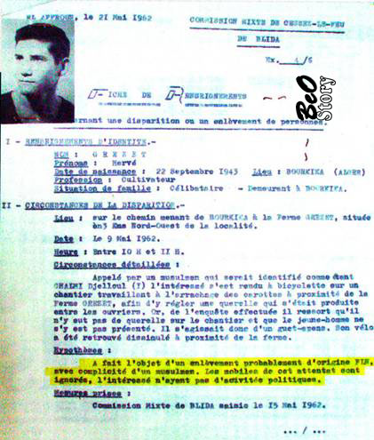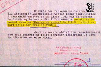 Dans un courrier classé « secret », le colonel de Reals, attaché militaire auprès de l'ambassade de France, demande des informations à un officier d'état-major : « D'après des renseignements récents [13 septembre], mademoiselle Claude Perez, institutrice à Inkermann, enlevée le 23 avril 1962par le FLN [...] est en ce moment dans un "centre de repos" du FLN, situé au bord de la mer, près de Ténès. Elle est détenue là avec deux autres captives enlevées à Dilian et à Orléansville. » L'auteur cite aussi le cas de « Mme Valadier, enlevée à Alger le 14 juin 1962 par le FLN, et retenue dans une maison close de la basse casbah. » Parvenue à s'enfuir et à rentrer en France, elle sera hospitalisée en neurologie à Nîmes en 1963. Son témoignage, cité à l'époque par plusieurs associations de rapatriés, ne sera jamais reconnu par la France. Il était pourtant vrai !