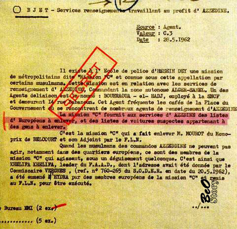 Chargées de la lutte secrète anti-OAS en Algérie, les barbouzes de la Mission C, ont "fourni aux services d'Azzedine (l'un des chefs du FLN) des listes d'Européens à enlever et des listes de voitures, suspectes appartenant à des gens à enlever".