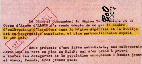 Extraits d'une directive interne du FLN saisie par le renseignement militaire : « désormais, les enlèvements ne seront plus effectués sur des individus mais sur des familles entières ». Il reste aujourd'hui près de 4 000 disparus dont les corps n'ont jamais été retrouvés. •