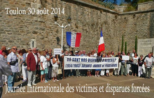 À l'occasion de la "Journée Internationale des victimes et disparues forcées", une cérémonie, simple mais combien émouvante, a eu lieu à Toulon en hommage aux disparus de la guerre d'Algérie (1954-1962), le 30 août 2014 en présence de nombreuses associations de rapatriés.