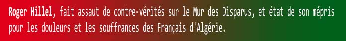 (...) L’auteur, Roger Hillel, fait assaut de contre-vérités sur le Mur des Disparus, et état de son mépris pour les douleurs et les souffrances des Français d’Algérie.
