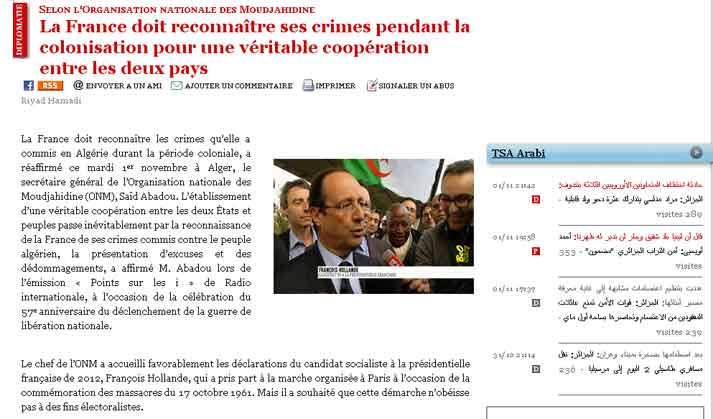 Il a, dans la foulée, fait l’éloge de François Hollande qui a promis que la France ferait repentance s’il était élu président de la République, et qui a participé à Paris à la marche anniversaire des émeutes insurrectionnelles fellouzes du 17 octobre 1961.