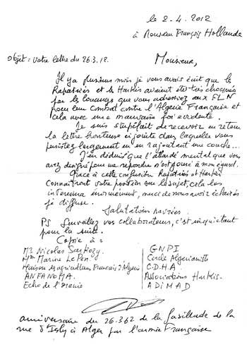 Vous vous souvenez peut-être qu'en hommage aux Algériens morts lors de la manifestation du 17 octobre 1961, j'ai déposé une gerbe, le 17 octobre 2011, au pont de Clichy, où des Algériens furent jetés à la Seine, il y a cinquante ans, par des policiers, placés sous les ordres de Maurice Papon, préfet de police.