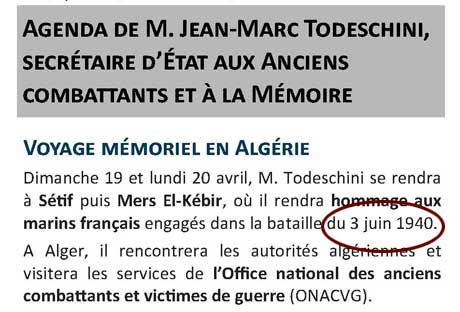 Un peu plus sérieux - D'abord une visite à Mers-el-Kébir au cimetière où se trouvent les 1300 marins qui avaient été tués par la flotte anglaise, le 3 juillet 1940 – il y a soixante-quinze ans cette année. Jean-Marc Todeschini se rendra au cimetière français, mais n'y prononcera pas de discours. Même silence à Sétif, où il devrait se recueillir devant un monument de Saal Bouzid , aucune visite n’est prévue au cimetière européen où se trouvent 29 victimes françaises des émeutiers du 8 mai 1945.