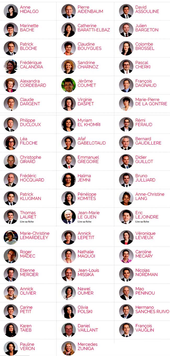 Les voyous du PS du Parti socialiste au Conseil de Paris, Véronique Levieux,Pierre Aidenbaum, Christophe Girard, Karen Taieb Attias,Florence Berthout, Marie-Christine Lemardeley,Pauline Véron,Rémi Féraudnote, Alexandra Cordebard,Bernard Gaudillère, Yamina Benguigui, François Vauglin, Nawel Oumer,Philippe Ducloux, Mercedes Zuniga, Catherine Baratti-Elbaz, Jean-Louis Missika, Sandrine Charnoz, Christophe Najdovski,Emmanuel Grégoire, Pénélope Komitès,Jérôme Coumet, Anne-Christine Lang, Jean-Marie Le Guen, Marie-Pierre de La Gontrie,Bruno Julliard, Annick Olivier, Carine Petit, Pascal Cherki, Olivia Polski, Hermano Sanches Ruivo, Caroline Mécary, Étienne Mercier, Anne Hidalgo, Claude Dargent, Annick Lepetit, Patrick Klugman,Éric Lejoindre, Myriam El Khomri, Daniel Vaillant, Afaf Gabelotaud, Claudine Bouygues, Didier Guillot,François Dagnaud , Halima Jemni, Roger Madec, Colombe Brossel, Léa Filoche, Nicolas Nordman, Mao Peninou,Frédérique Calandra, Julien Bargeton, Virginie Daspet,David Assouline, Marinette Bache, Frédéric Hocquard, Nathalie Maquoi |