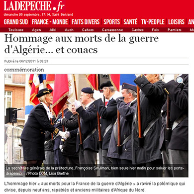 Ils étaient presque tous là. Les représentants des rapatriés harkis ; le comité d'entente des combattants de la Haute-Garonne et de tous les conflits ; l'association nationale des prisonniers de guerre combattants d'Algérie, Tunisie, Maroc ; l'Union nationale des anciens combattants Indochine, Tunis, Algérie… en tout une dizaine d'associations d'anciens combattants et porte-drapeaux. Manquaient à l'appel toutefois, la très emblématique Fnaca (Fédération nationale des anciens combattants), des élus ou représentants de la région, de la mairie de Toulouse, conseil général excepté. source : http://www.ladepeche.fr/article/2011/12/06/1232881-hommage-aux-morts-de-la-guerre-d-algerie-et-couacs.html |
