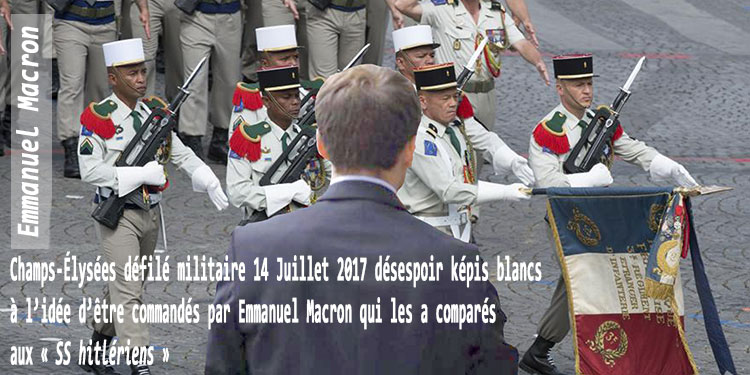 Il faut imaginer avec horreur une voiture, vide, bien sûr, puisque cet homme ne représente rien et n’est rien, descendant les Champs-Élysées pour le défilé militaire du 14 Juillet un peu avant ou un peu après que la Légion eut descendu de son pas lent la “plus belle avenue du monde” et nous songeons au désespoir sous les képis blancs à l’idée d’être commandés par quelqu’un qui les a comparés aux SS hitlériens en osant dire que la colonisation était un crime contre l’humanité.