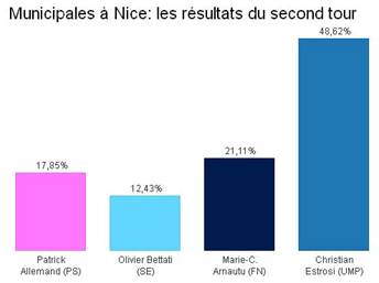 Comme prévu, Christian Estrosi a été largement réélu (48,62%) devant Marie-Christine Arnautu (21,11%), Patrick Allemand (17,85%) et Olivier Bettati (12,43%).