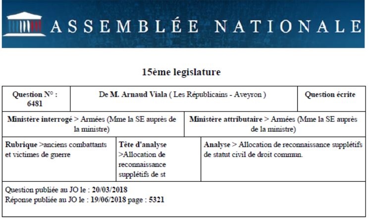 M. Arnaud Viala interroge Mme la secrétaire d'État, auprès de la ministre des armées, sur l'allocation de reconnaissance supplétifs de statut civil de droit commun. Les membres des forces supplétives en Algérie avaient deux statuts différents, selon qu'ils étaient arabo-berbères et de statut civil de droit local, ou de souche européenne et de statut civil de droit commun.