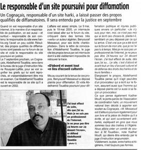 La justice pourrait aujourd’hui reprocher à Mr Amid Toualbia , en tant que Web master, de n’avoir pas supprimé immédiatement cette «contribution» qui est restée que quelques heures sur le forum du site.
