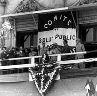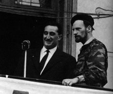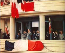 Si c'est le cas, il ne s'est pas trompé. Une chose est sûre : pour lui, la voix algérienne bruyante qu'il a entendue dans les rues est la seule vraie et elle éclipse celle des musulmans fidèles à la France, qui ne tiennent manifestement plus aucune place dans la perspective gaulliste. Parallèlement, De Gaulle affirme vouloir « mettre à la raison » les « meneurs européens »pro-Algérie française. Il se dit même décidé à les « briser ». Le rétablissement de la peine de mort était prévu pour ça. Ordre est donné de dissoudre le Front de l'Algérie française et d'en arrêter les dirigeants. |