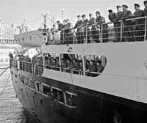 Deux jours après, des camions militaires, depuis le Camp Saint Vincent, nous ont transportés au port de Mers El Kébir pour être embarqués. Mais les véhicules militaires pour ne pas traverser la ville ont dû emprunter la corniche et ensuite accéder au port. Durant ce trajet, nous portions la tenue militaire, les pieds noirs qui nous voyaient sur le camion nous suppliaient : « Ne partez pas ! Restez avec nous ! On va nous tuer ! » Quel drame atroce, nous avions beau crier « mais nous sommes Pieds Noirs, nous aussi !»
