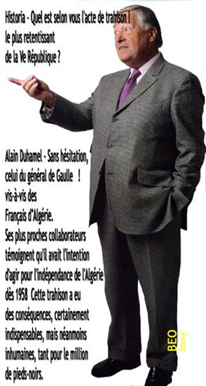 Alain Duhamel - Sans hésitation, celui du général de Gaulle ! vis-à-vis des Français d"Algérie. Ses plus proches collaborateurs; témoignent qu'il avait l'intention d'agir pour l'indépendance de l'Algérie dès 1958, mais il était beaucoup trop intelligent pour dévoiler ses objectifs dès le départ. En fait, il s'est retrouvé dans l’obligation de mettre sur pied un « simulacre pédagogique ». Cette trahison a eu des conséquences, certainement indispensables, mais néanmoins inhumaines, tant pour le million de pieds-noirs que pour beaucoup d'Algériens.