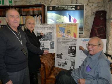 De gauche à droite, Hervé Cuesta, pied-noir, président du collectif « Non au 19 mars 1962 », Michèle Soler (Cercle des Algérianistes), et André Loré (Comité d'action patriotique) devant les coupures de journaux de l'époque où le général de Gaulle proclame son attachement à l'Algérie française.