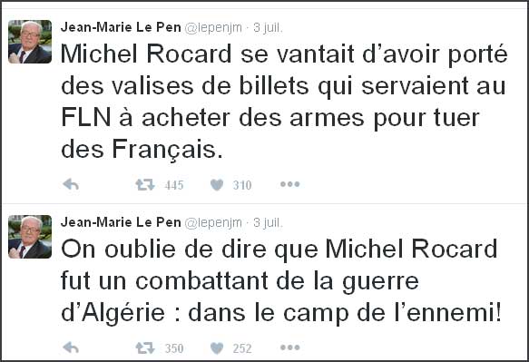"On oublie de dire que Michel Rocard fut un combattant de la guerre d'Algérie: dans le camp de l'ennemi !", a écrit dimanche matin Jean-Marie Le Pen.