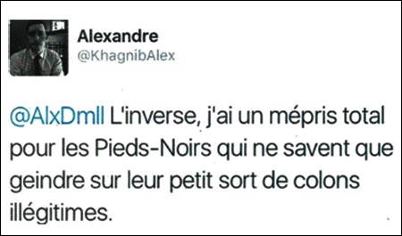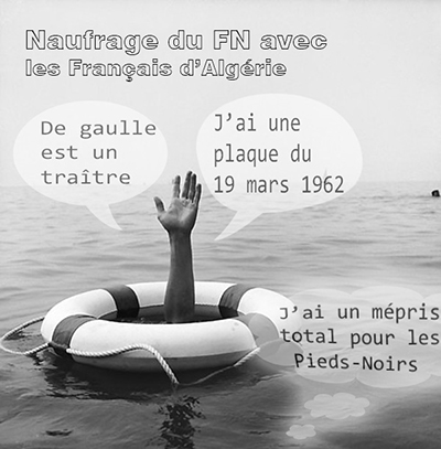 Non, ce n’est pas un socialiste, un gauchiste, qui a prononcé de telles paroles, de telles insultes, mais un cadre du Front national, qui a ajouté ensuite :« J’ai un mépris total pour les « Pieds-Noirs » qui ne savent que geindre sur leur petit sort de colons illégitimes. .C’est Alexandre Benoît, assistant parlementaire de la députée européenne FN Sophie Montel, conseillère régionale de Bourgogne-Franche-Comté et seconde de la liste de Florian Philippot, qui a insulté toute une communauté, dont la majorité se range derrière le Front national de Jean-Marie Le Pen, puis de Marine, depuis sa création. |