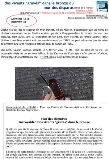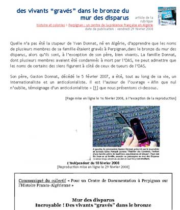 | Un habitué du piratage des images des sites web des Rapatriés d'Algerie, le site internet de la LDH de Toulon , un exemple parmi d'autres les images volées sur le site Bab el oued story après l'inauguration du mur des disparus, vol constaté par un huissier, le site avec l'image volée, puis modifié avec la même image elle même volée au journal l'Indépendant de Perpignan , lui même voleur d'images de BEO Story, les deux complices du piratage des images de BEO Story. |