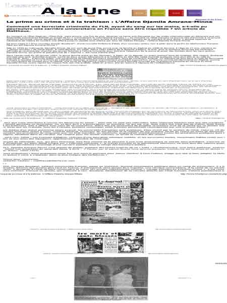Au moment où l'État Algérien -l'État-FLN- vient encore, une fois de plus, déverser sa haine anti-française sur les ondes internationales en déclarant que son Assemblée examinerait bientôt un projet de loi « criminalisant le colonialisme français » ; au moment où l'état français ne trouve rien d'anormal à ce qu'une ancienne terroriste vienne bénéficier du système de santé d'un pays qu'elle avait combattu naguère de la manière la plus lâche, il semble opportun et nécessaire de mettre en lumière une affaire jusqu'ici passée sous silence par tous les médias français : l'affaire Djamila Amrane-Minne.