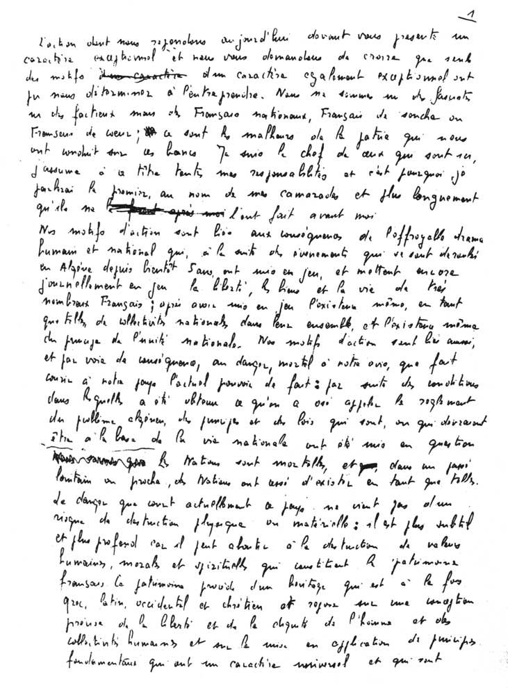 C'est à partir de la constatation selon laquelle le Général de Gaulle est coupable des crimes de forfaiture, de haute trahison et de complicité de génocide, que nous avons agi conformément aux possibilités que donne la loi. Nous croyons que cette action était juste ; car les mobiles de cette action sont ceux que dictent la morale, le droit et la raison humaine ; car la morale, le droit et la raison humaine s'accordent à reconnaître que la politique du Général de Gaulle est à la fois immorale, illégale, aberrante et infamante.
