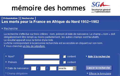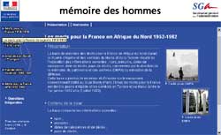Trouver les militaires morts pour la France en Afrique du Nord 1952-1962 . Une base de données Mémoire des hommes est destinée à mettre à la disposition du public des bases de données réalisées à partir de la numérisation et de l' indexation de fiches biographiques conservées par le ministère de la défense. Il a également pour vocation d' honorer la mémoire de celles et ceux qui ont participé ou donné leur vie au cours des conflits de l' époque contemporaine.
