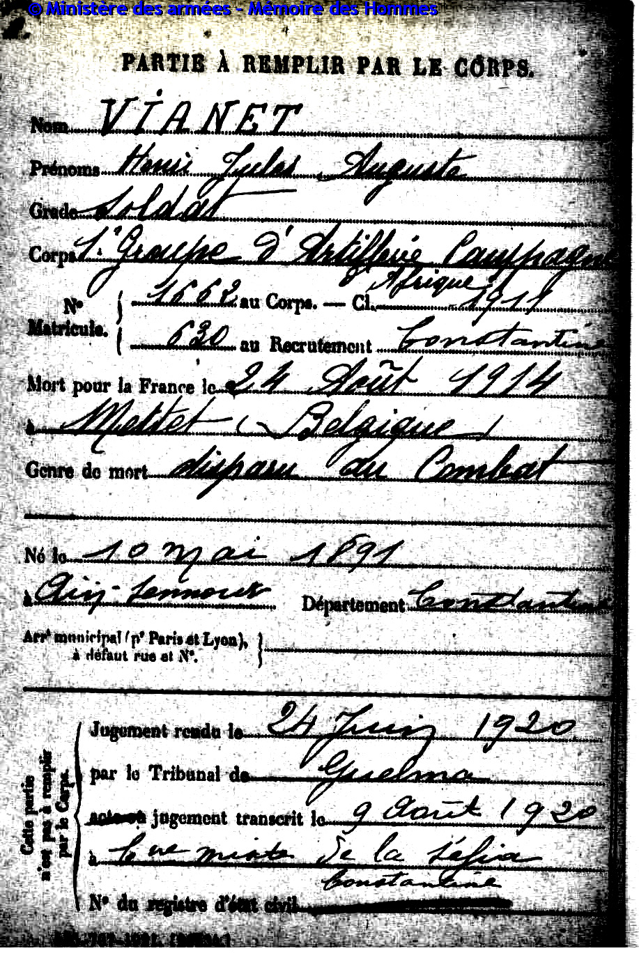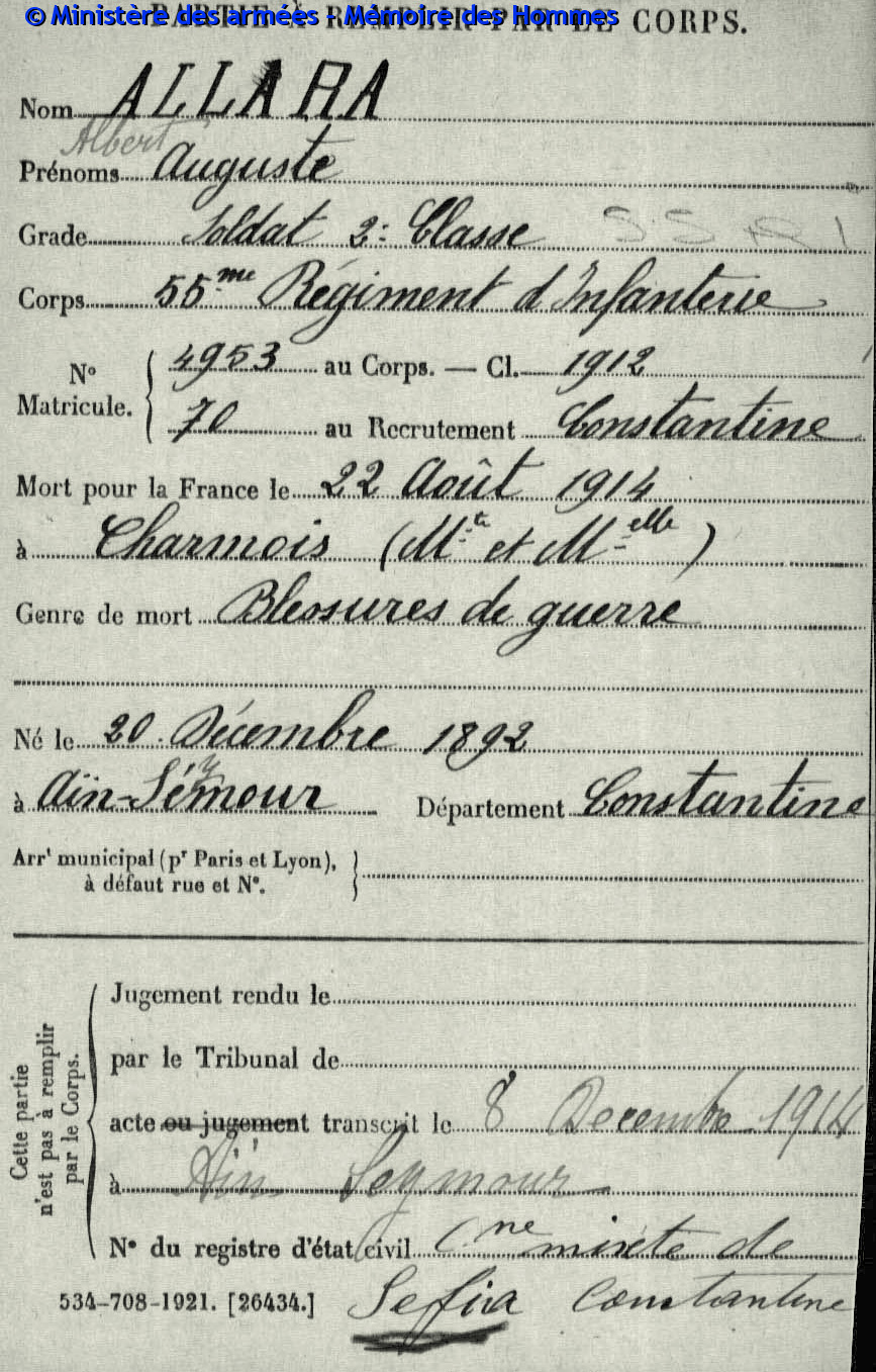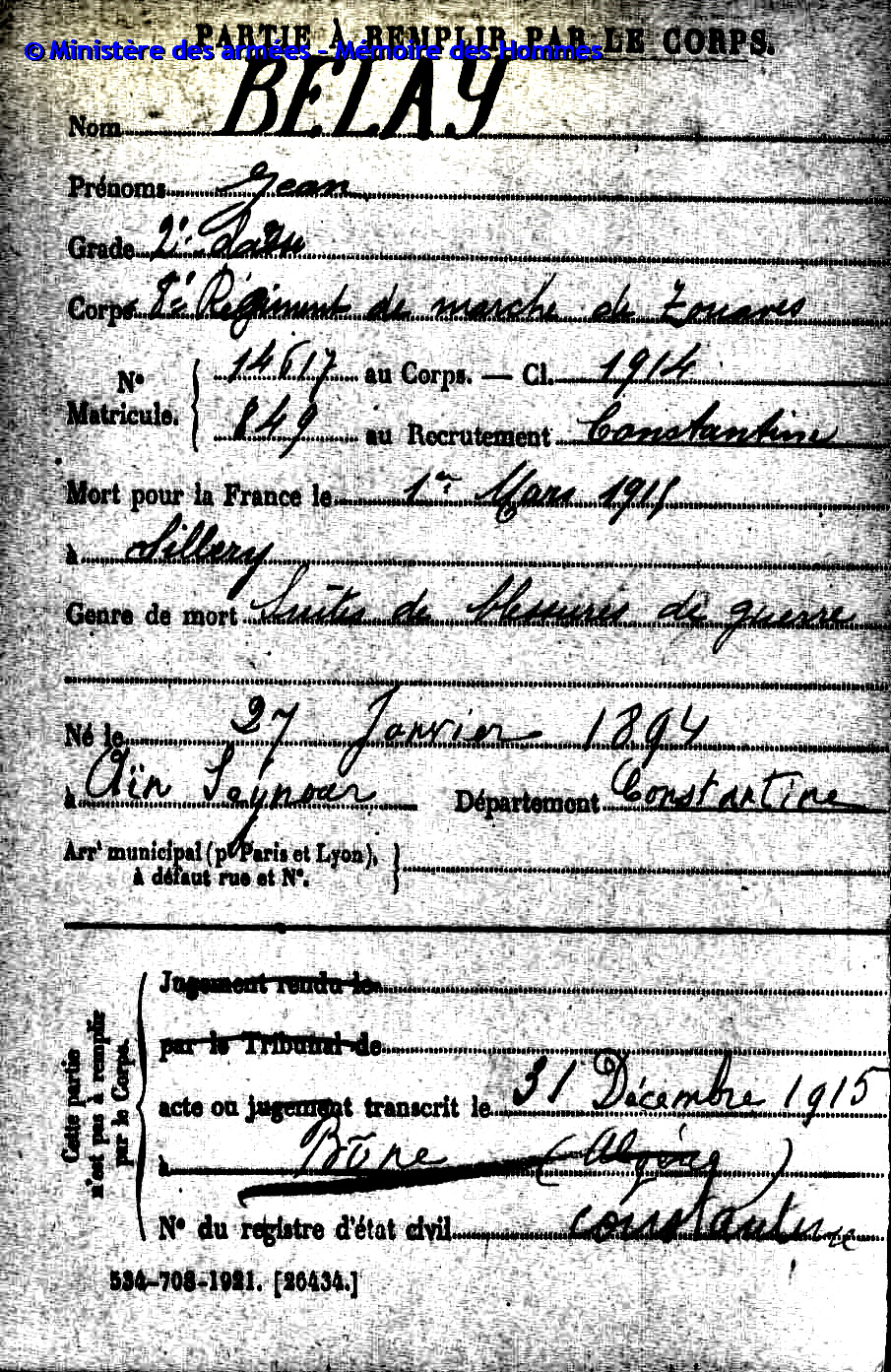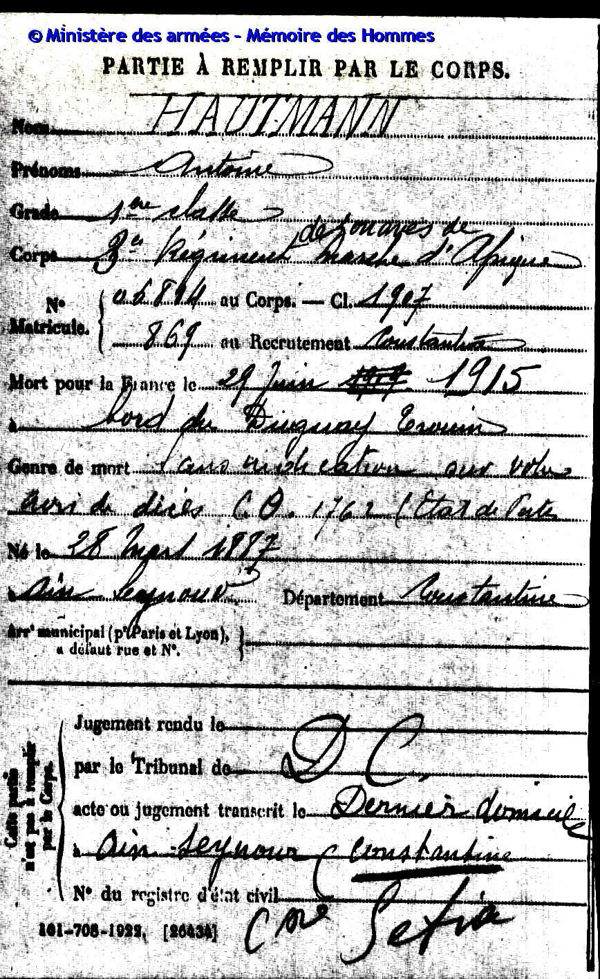 Matricule au recrutement : 70 - Constantine (Algérie) -