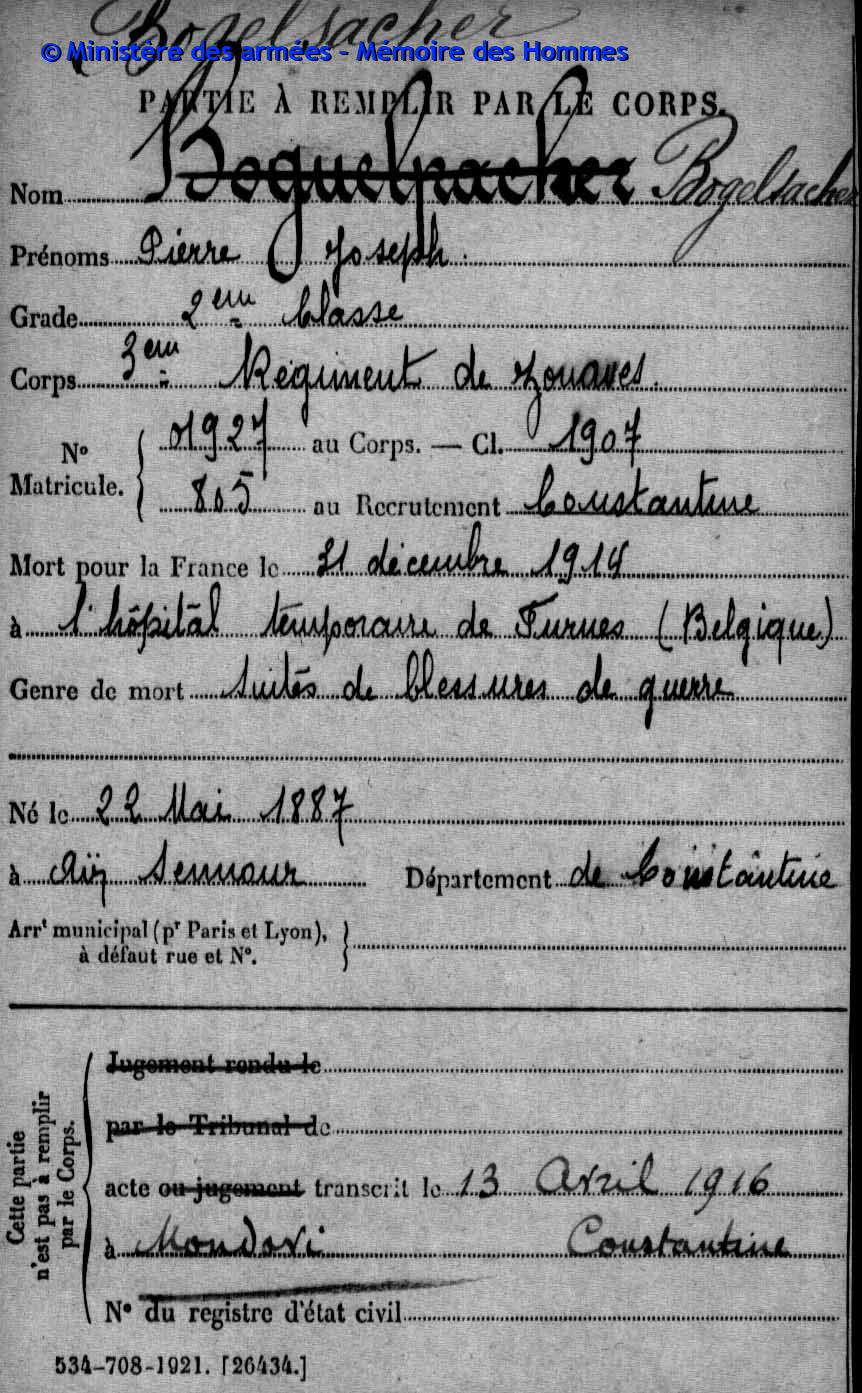 Orthographié BOGELSACHER sur le monument et sur le site "Mémoire