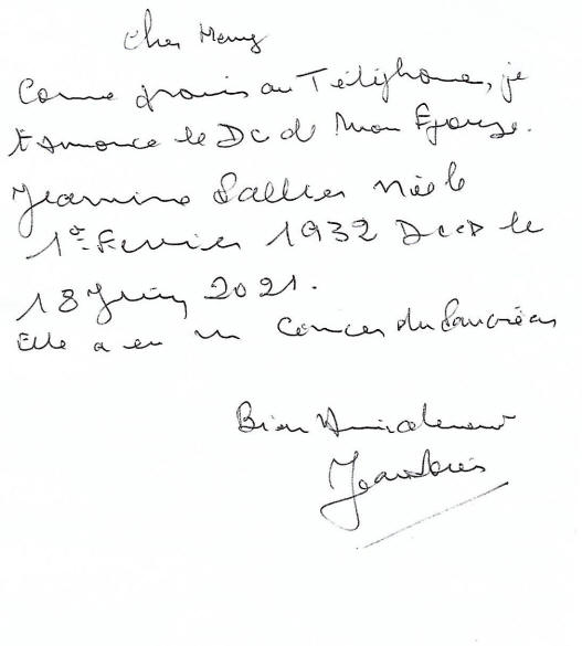 cousin Madame Rousselon est décédée j'espère que tu vas bien je